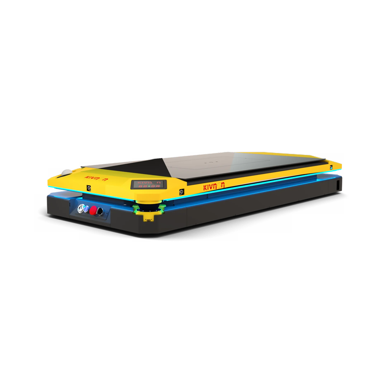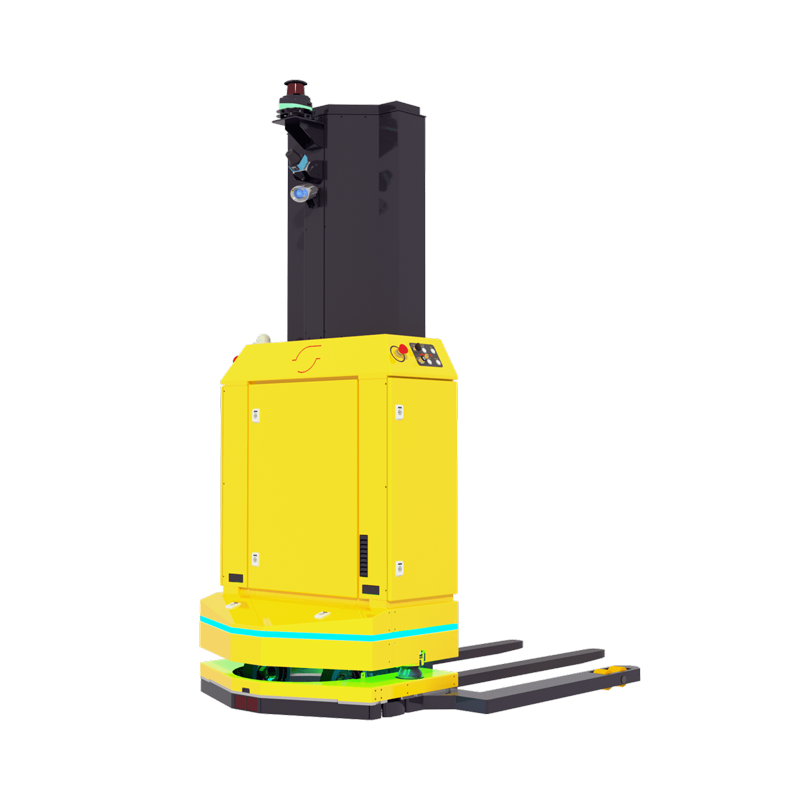 Robot compacto e robusto para transporte de carga, adequado para ambientes de armazenamento densos, com design slim para facilitar a navegação em espaços apertados.